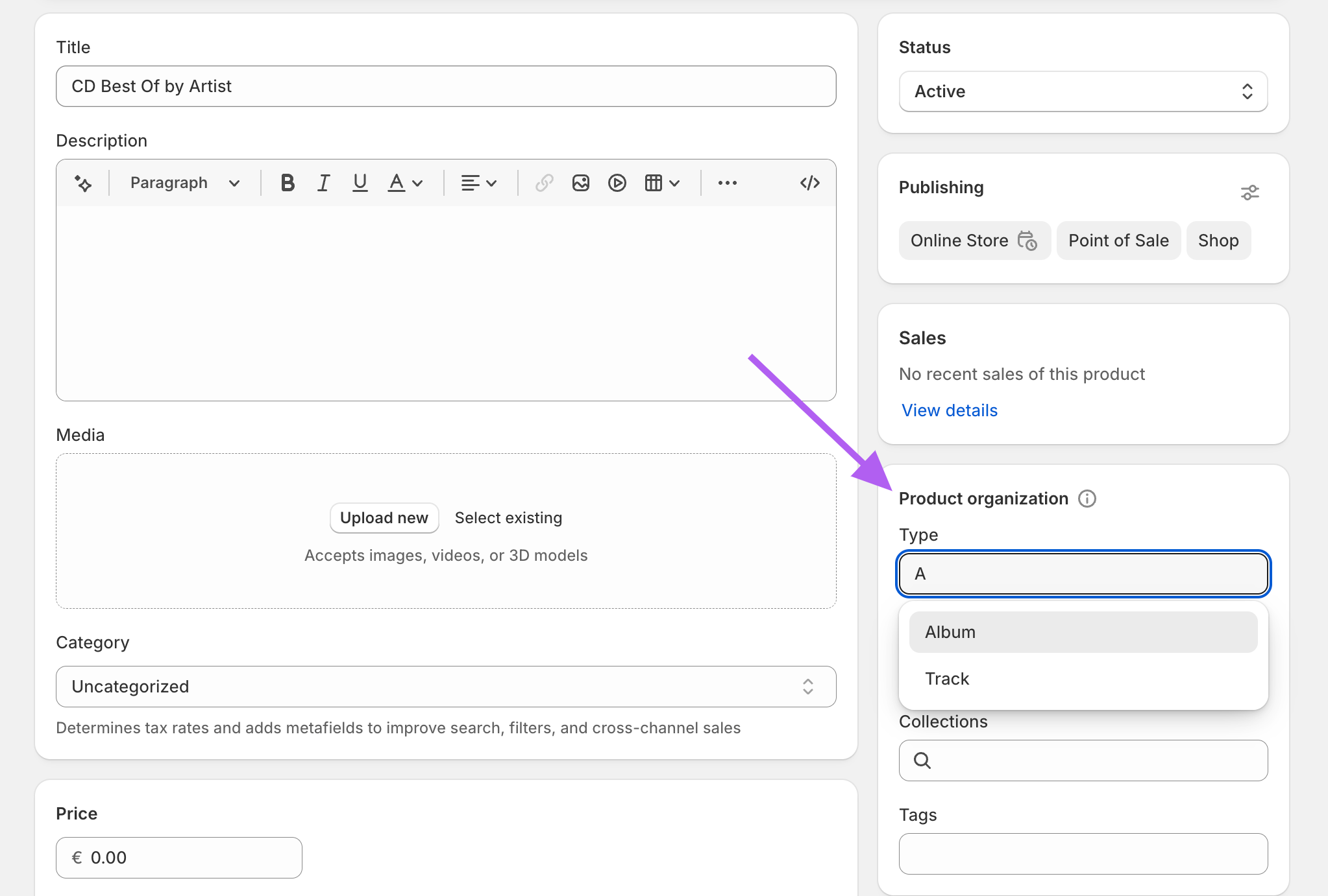 Set the "Product Organization" → Product Type field to either “Track” or “Album”.