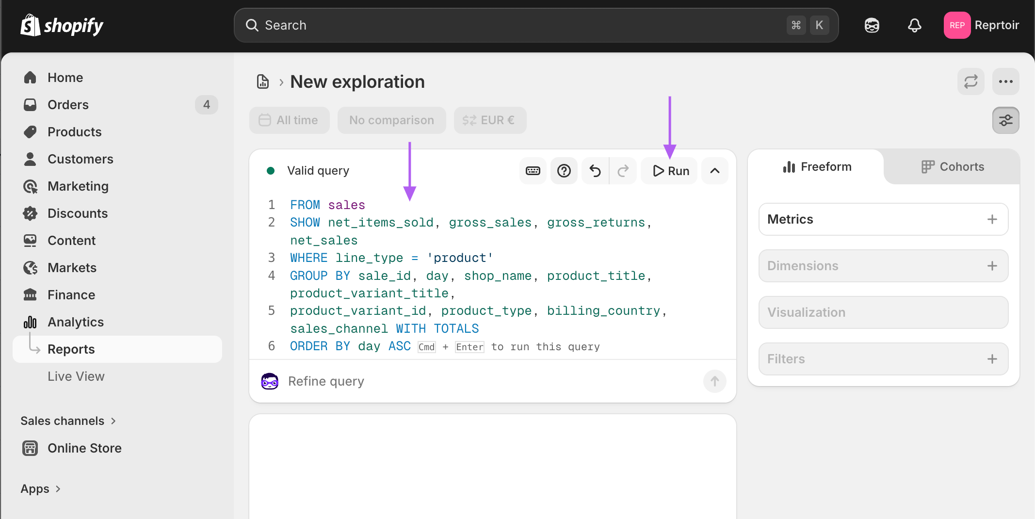 - Replace the text displayed in the editor with the following ShopifyQL query.