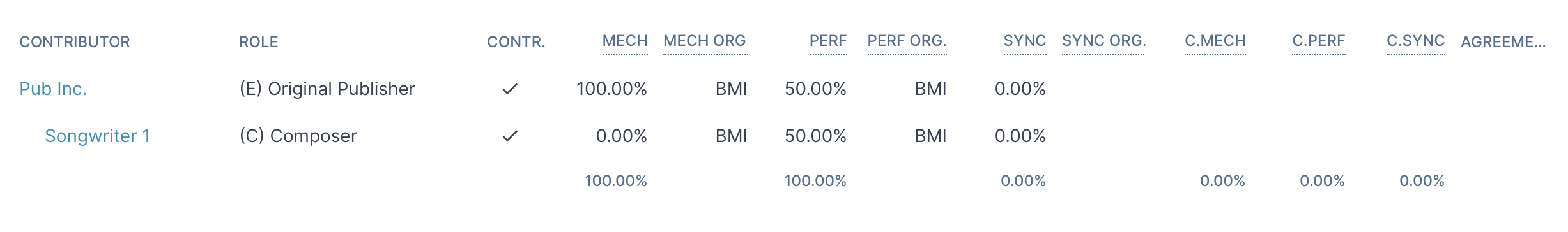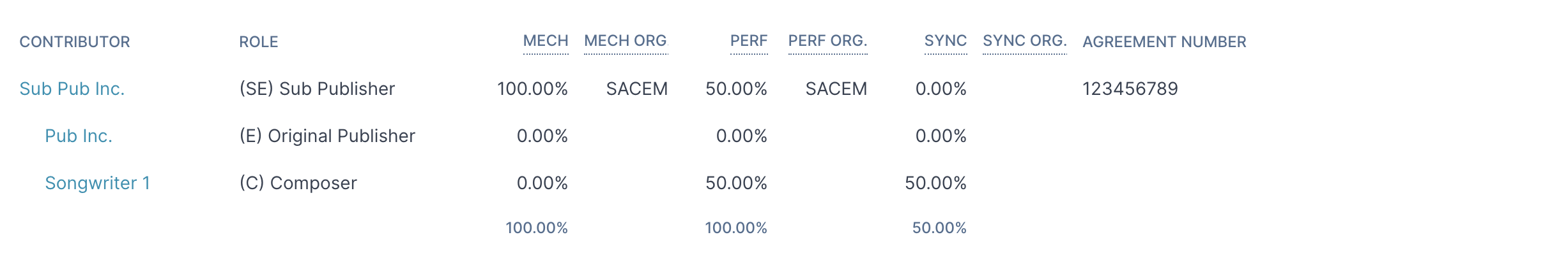 DisclaimerThe example shown in this documentation is provided for demonstration purposes only. It illustrates how a sub-publishing agreement can be represented in Reprtoir in a way that is fully CWR compliant.